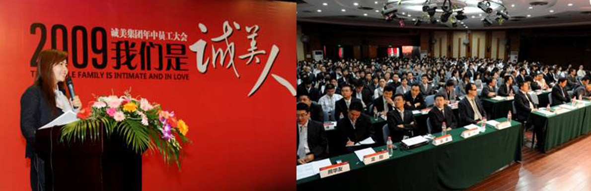 2003年诚美启动中国市场迄今,已经胜利完成了第一个五年战略目标,目前拥有全国近1500家优质客户,更凝聚了500多名优秀的人才。2009年诚美进入了第二个五年发展阶段,终端品牌建设成为了这一时期的核心战略目标,输出诚美价值观和诚美商业模型是这一时期的主要任务。在此背景下,2009年9月1日至3日,“我们是诚美人”2009年中员工大会隆重召开,自此宣告着诚美第二个五年战略规划的全面起航。