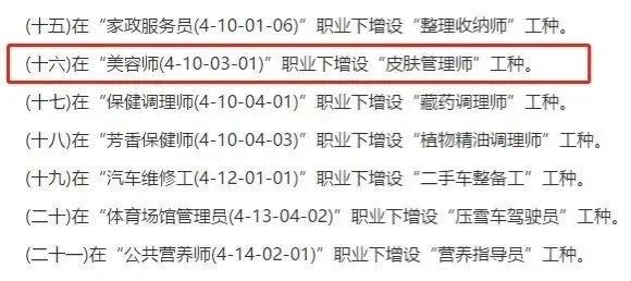 2021年1月,国家人社部发布了《关于对拟发布集成电路工程技术人员等职业信息进行公示的公告》,由中国美发美容协会副会长单位哈尔滨华辰生物科技有限公司牵头申报的“皮肤管理师”正式获批成为“美容师(4-10-03-01)”职业下增设的新工种。在美容师名称下增设新工种,是自1993年来美容行业首次。