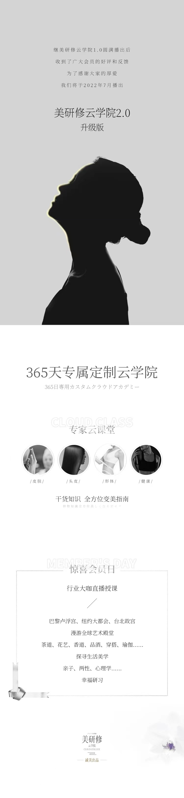 美研修是一套为诚美会员量身定制的线上云服务平台,通过智能、专业、标准化且无任何销售氛围的高品质附加服务来建立起门店美容师与高端会员之间的联系。2022年7月1日,美研修云学院2.0版本正式上线,365天私人定制云学院,每周末大咖艺术直播课程,带妳一起研修生活美学,开启逆龄变美之旅。